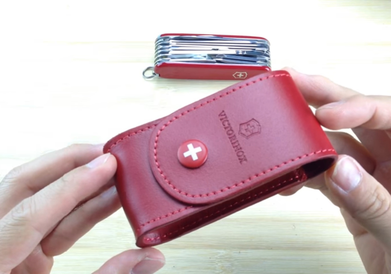 Чехол имеет петлю для крепления на ремень и закрывается стальной кнопкой, на которой изображен государственный флаг Швейцарии.